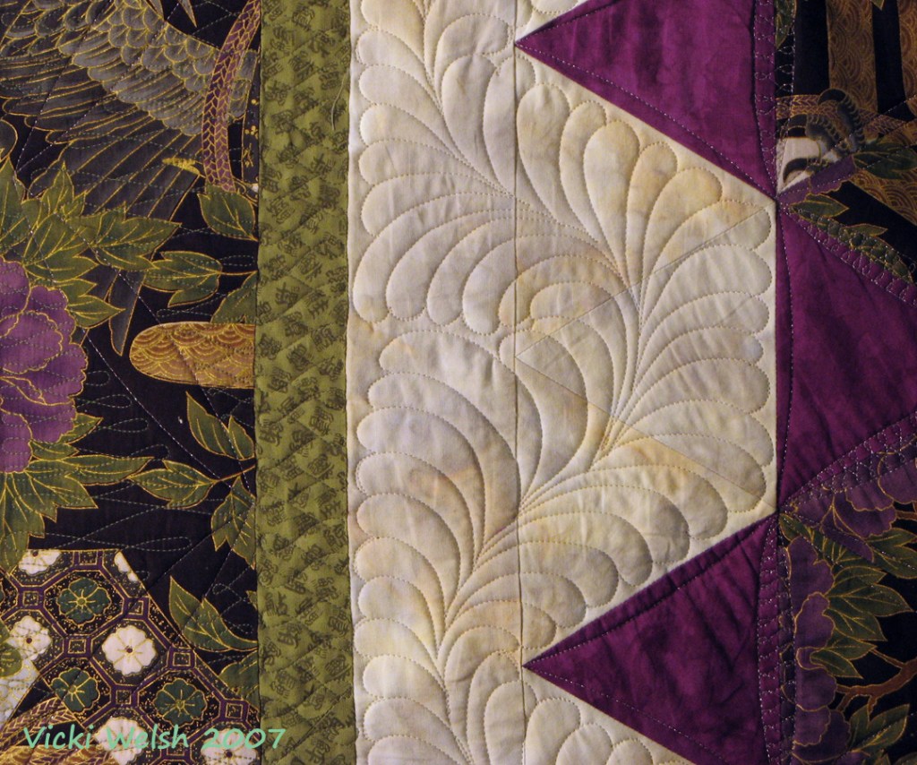 September – Anti-Watercolor quilt. A few years before making this I cut up thousands of 2″ squares with the intention of making watercolor quilts. I did one small sample and realized that I hated the technique. I took the squares and divided then into light and dark to make this simple quilt. I quilted it will all-over feathers. I used this in the guest house for a while but eventually gave it to my sister-in-law, Carol Ottaway.