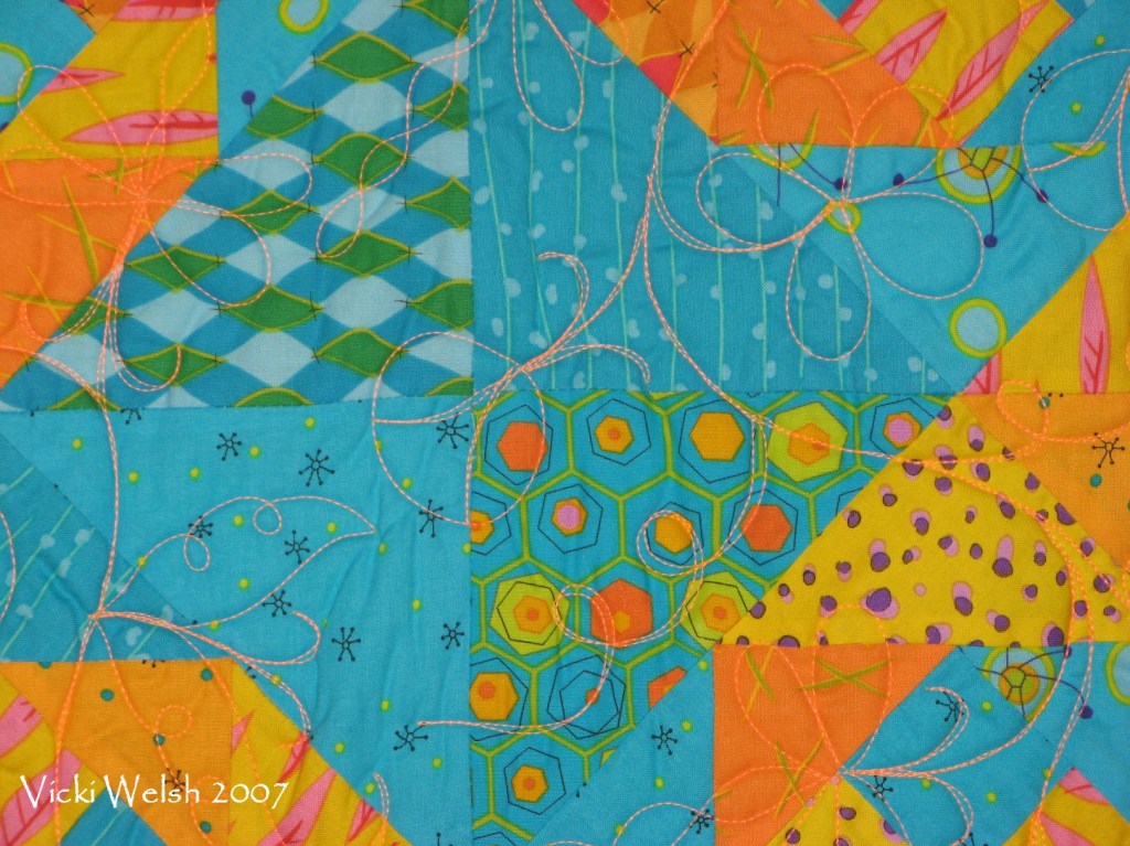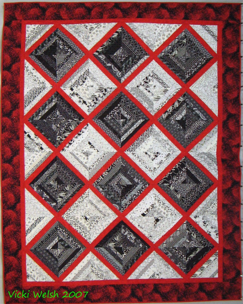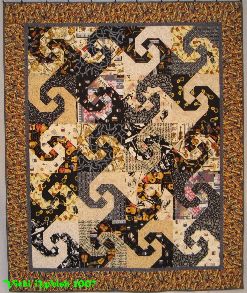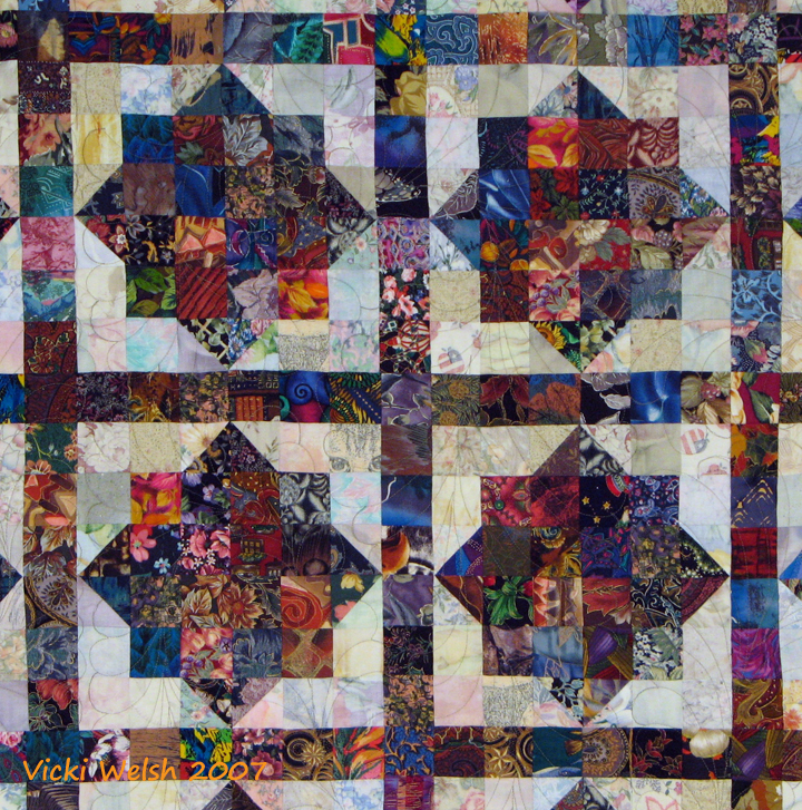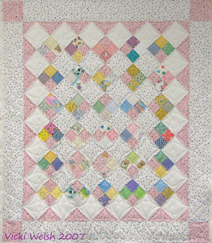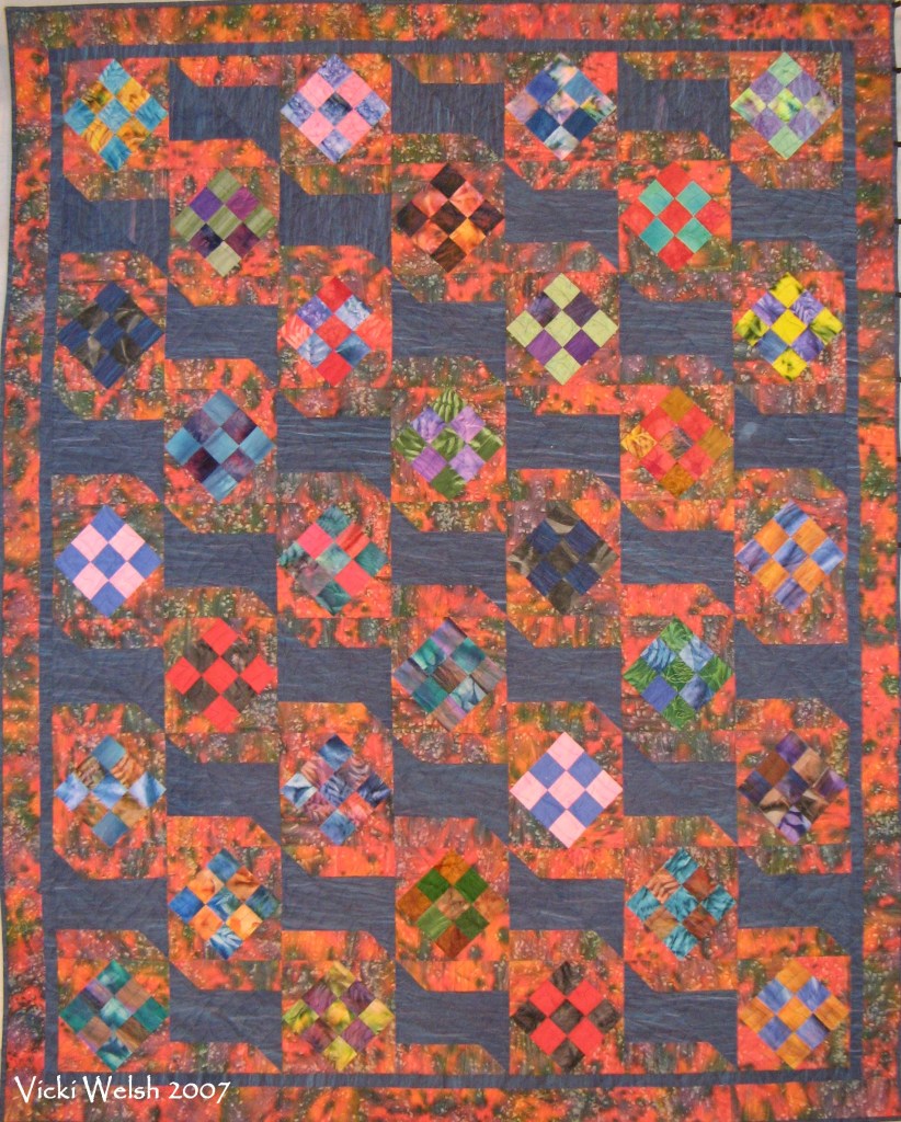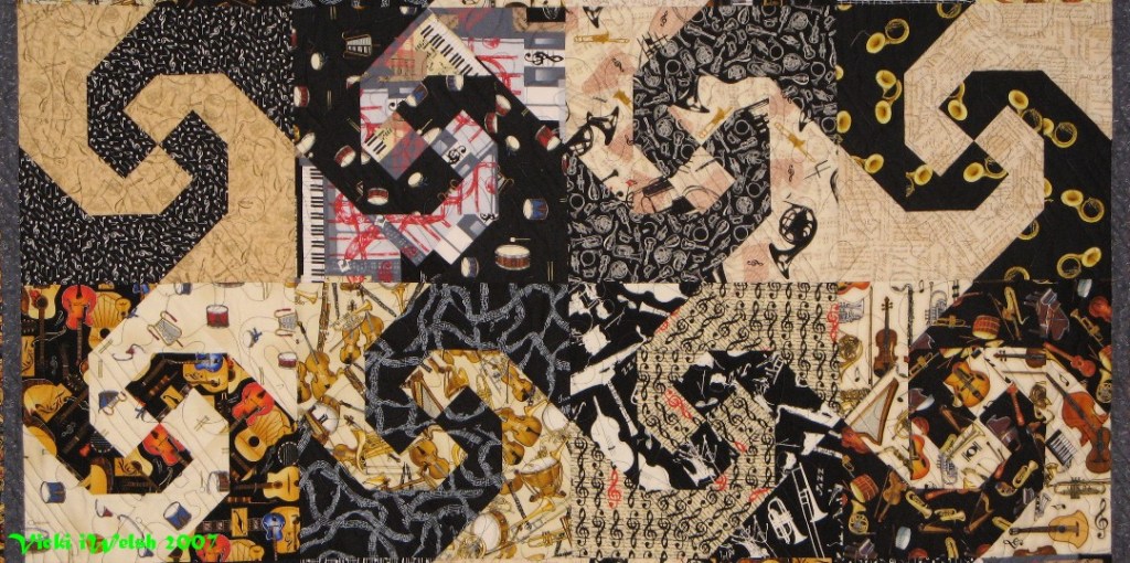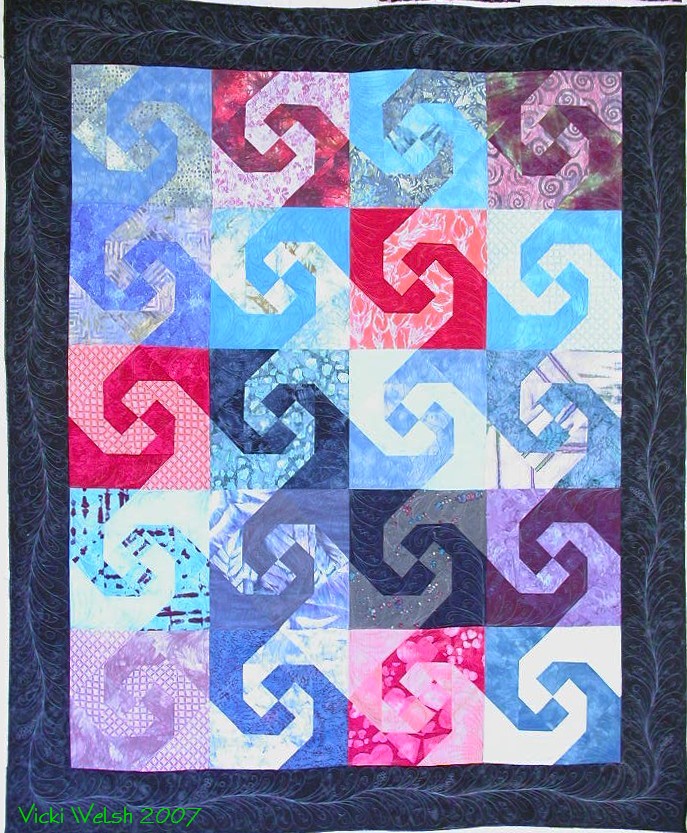 Around this time I was buying most of my fabric in fat quarter sizes. When Anne and I made the gift quilt it was a pattern meant specifically for fat quarters. I then became a little obsessed with creating other block patterns that would best utilize fat quarters. The Snail’s Trail block was the next one I worked on and I made several quilts in this pattern. Some full size and some baby quilts. These are the ones I finished in 2007.