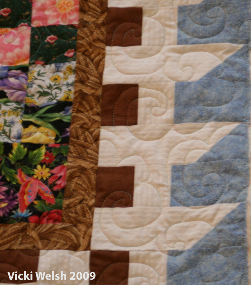 This quilt was made from Broken Wheel blocks pieced by my Great Grandmother Flora Texas Goad Rakes. Mom made the quilt and I quilted it. You can see more of Flora’s quilts that we have finished here.