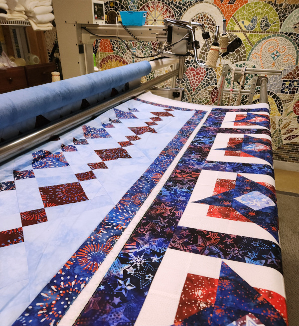 After that I got into the sewing room late in the afternoon and I pieced some end-of-bolt pieces for quilt backs. I got a back made for these 2 veterans quilts and got them loaded.