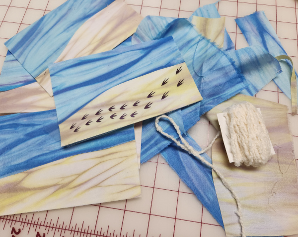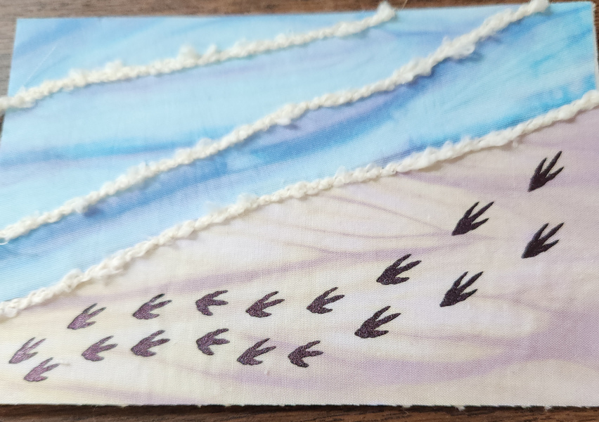 The only stitching was to couch down the yarn. The bird tracks came courtesy of the Cricut. I had a purple metallic that was perfect.