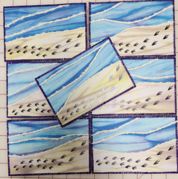 I was able to get 7 cards from the 2 fat eighths of Shibori and I had just enough of the purple vinyl to cut 7 sets of bird tracks so these cards were meant to be! There’s plenty of the cream yarn leftover for another project.