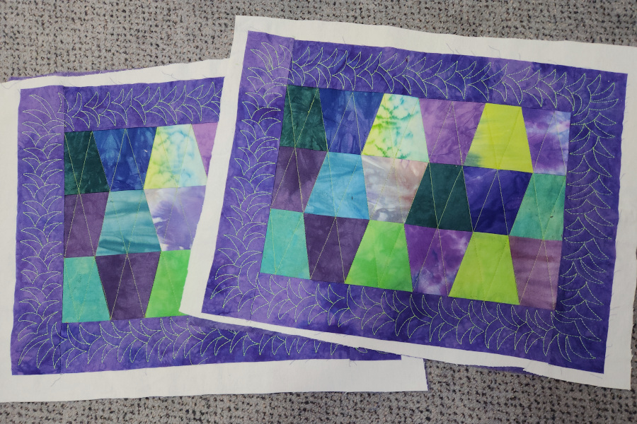 Of course, if I had cut one big back and loaded these on the longarm, it would have taken no more than 30 minutes and my stitch pattern would look 100 times better. I’m really rusty at free motion on the sit-down machines. I have 2 more placemats to quilt and I think I will try to do them on the longarm because they will benefit from free-motion. It will be so much easier and faster.