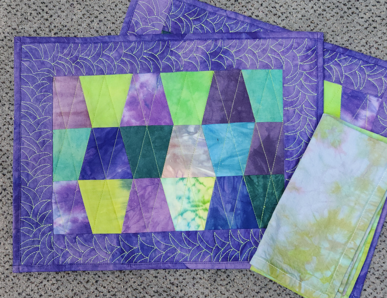 Yesterday was an absolutely beautiful day so I spent a lot of time outside doing yard maintenance. In the afternoon I got back in the sewing room and got 2 sets of placemats bound. the first one are these purple ones. I wasn’t too happy with these as pieced tops but I’m really happy with them now.