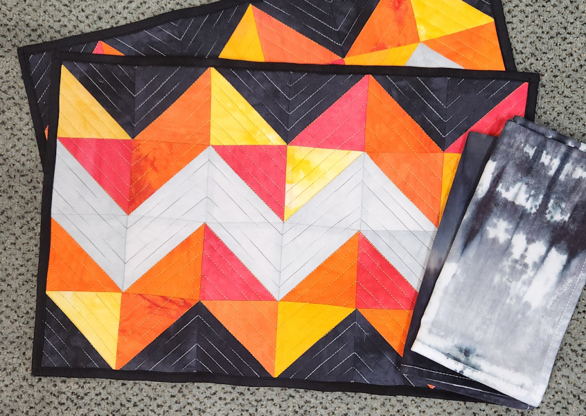 I only got the binding on two placemats because I was distracted most of the day cleaning the guest house. This set is, hand down, my favorite of the new ones. They are a little wide at 18″ but I didn’t want to trim the side triangles.