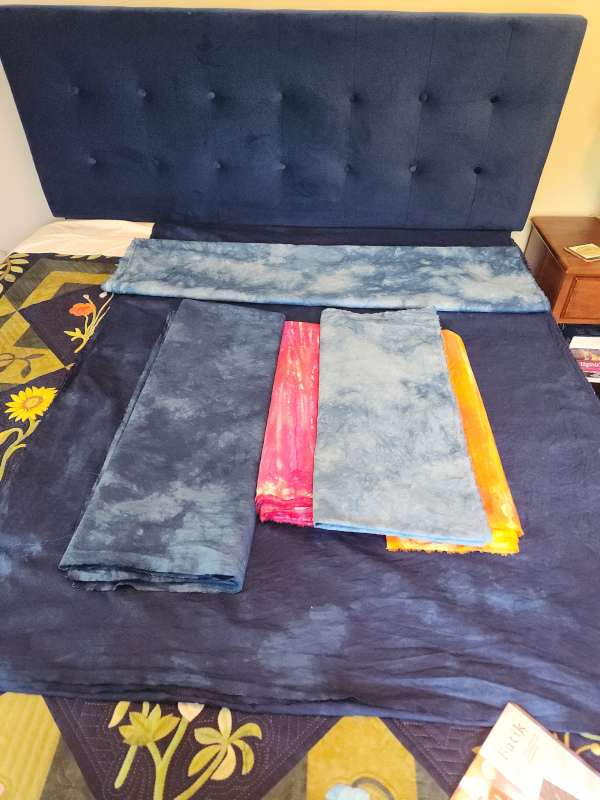 I also finished processing all the fabric for the new quilt for the new guest room. Now the lighting is horrible in the photo. The walls in this room are gray! But the colors are good enough to show how well I matched the blue of the headboard! But as I looked at the fabrics together I realized that I want the medium and light blues on top in this photo to be lighter. So I’ll dye more this weekend.