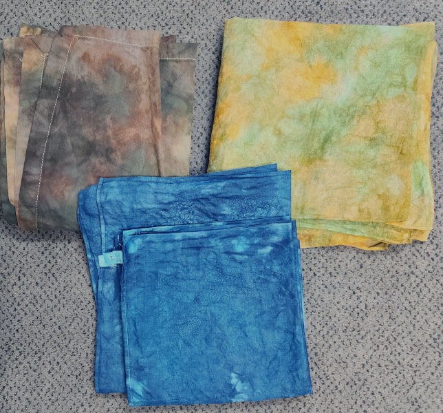 I had some leftover dyes so, of course, I dyed more placemats. There are 8 of the browns, 6 of the acid green and 4 blues. They will end up matched with some placemats some day. I get all these old linens from a friend of a friend. She collects fabric donations and belongs to a group that uses lots of it. What she can’t use she has a network of places where she can donate it. Often people throw in linens and she doesn’t have a place for them so she passes them to me. I have way too many but sometimes I can find someone who uses cloth napkins who are happy to receive a random stash of dyed napkins.