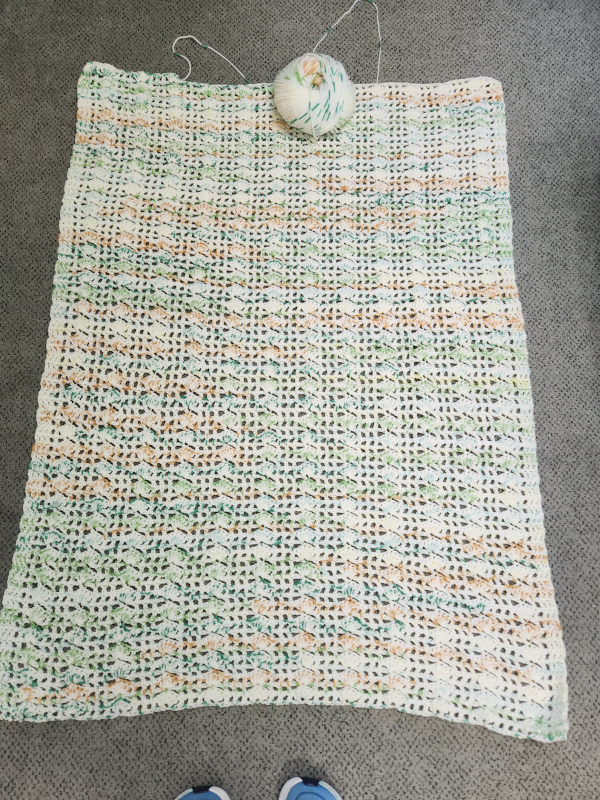 I didn’t get any sewing in today so I thought I’d catch up on my other 2 crochet projects. This is the big blanket and it’s about 50″ long. I will finish out this ball for the length and then I’ll use the last ball for the border.