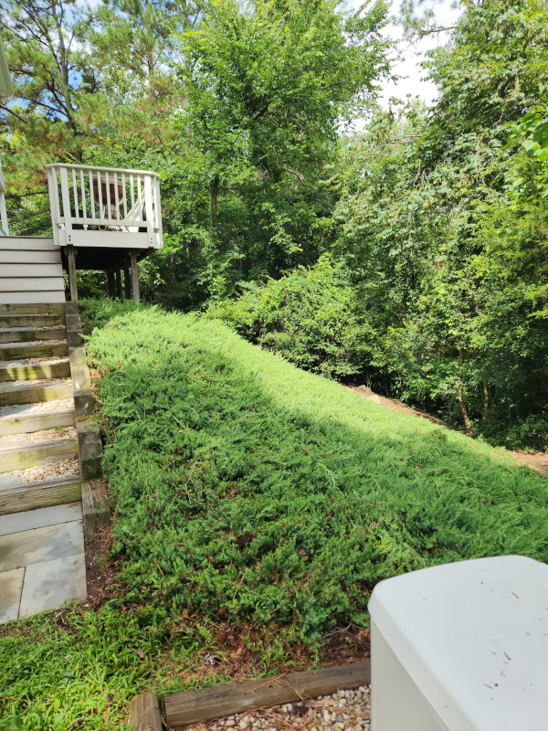 First, I weeded. A lot. This is both sides of the back of our house. The guy who built it pushed the house as far back on the property as possible without going over the cliff. the property goes almost straight down from here to the river. This is a 10 acre lot. There was no good reason for that. He could have moved it up 50 yards and we would have had a backyard. Instead, we live on a cliff. This hill is too steep to do anything with so we planted it years ago with creeping juniper and it works great as a ground cover. It still gets a lot of weeds and I haven’t tended it in at least 3 years. I should have taken before photos because it looked like tall grass and even had a couple of trees in it! It took 3 mornings (before it got too hot) but I eventually got it done. It hasn’t looked this good in years.