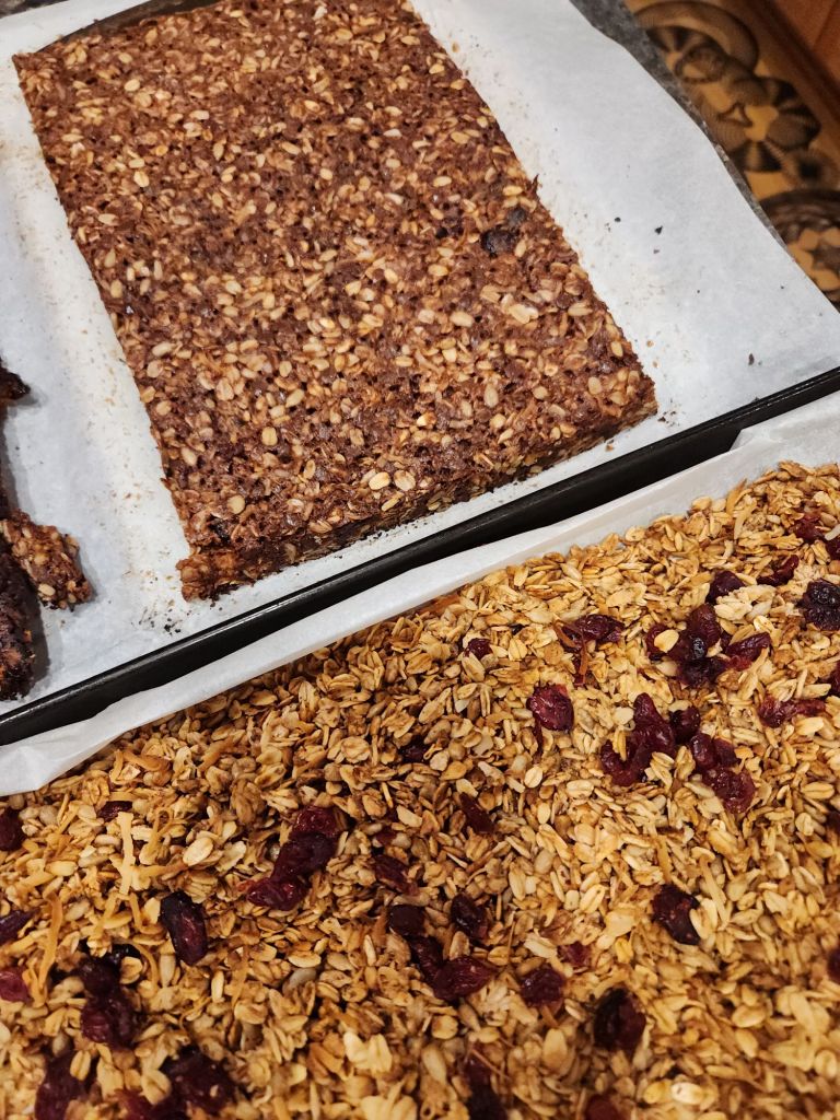 Staying in the kitchen after dinner, I made two types of granola. I’ve never bothered making granola before because I could find commercial ones that fit in my allergy restrictions. That option ended recently when I discovered that I’m also allergic to rice! Everything gluten-free contains rice. It turns out that granola and granola bars are really easy to make.