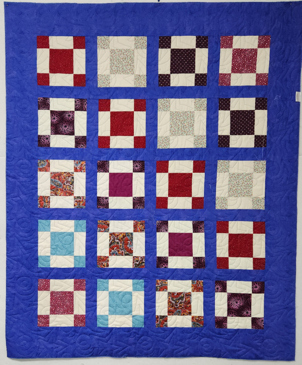 This quilt was made by Gwendolyn. One thing I love about the quilts we make is that everyone is great about using scraps and leftovers. The center strips that she used in this quilt is from leftover backing from earlier quilts. Brenda and I save the backing pieces that we trim from the quilts. We use some of them and other members take the rest. Nothing goes to waste.