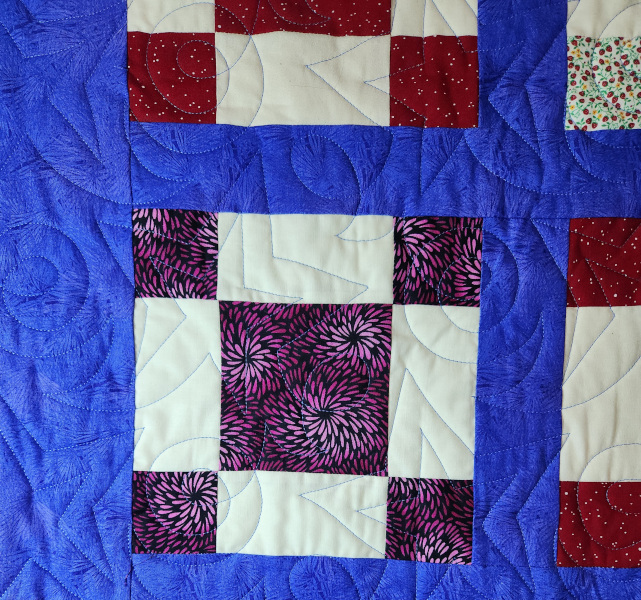 I quilted this and the next quilt with my favorite star and swirl pantograph. I used blue thread because I had a cone I wanted to finish off. This might have looked a little better with cream thread but I don’t think cream would have looked good at all on the next quilt. I always quilt two veterans quilts together so I have to pick a thread that will work for both.