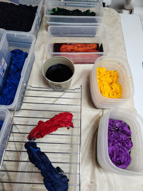 I also wanted to use up some dyes that will expire in the next month. I did some of that in 2 ways. First, I was given some white fabrics recently. They are in the 4 containers at the top of the photo. Two if them are heavier twill. I just used whatever dye I had and these fabrics will just go into the stash for future use.