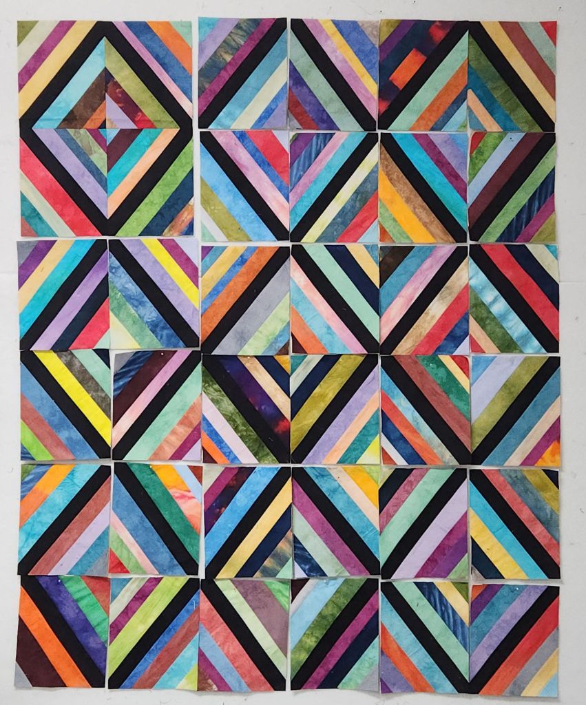 I took a second kit with me yesterday, and after I finished the string blocks, I started piecing these. I should be able to get the rest of the blocks pieced today. I’ll bring them home to do a layout later.