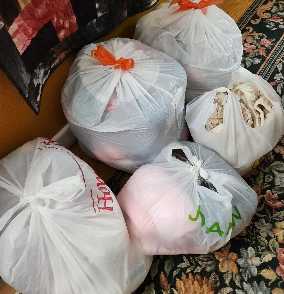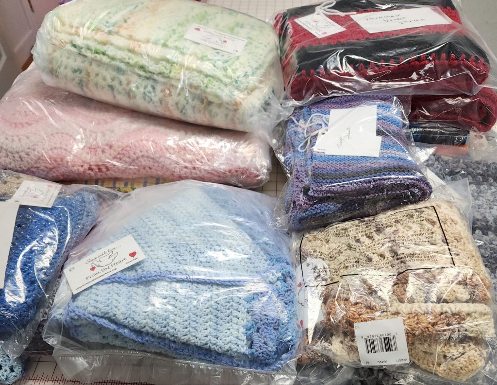 Yesterday, it was finally time to deliver my collection of items to From The Heart. Once I emptied the closet, I realized that it’s been about a year since I last donated items. I had a lot of things! They don’t require, and probably don’t want, plastic bags, but it helps me keep them clean and organized. I delivered 2 big blankets, 9 fidget mats, 5 wheelchair blankets, 7 shawls and 2 scarves.