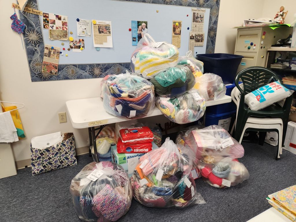 For people who don’t have the funds for materials, they have a large assortment of yarn and fabric for volunteer makers to take. They even have lots of patterns. Every time I visit, there are several ladies stitching away in the front room. It’s set up like a comfortable living room.
