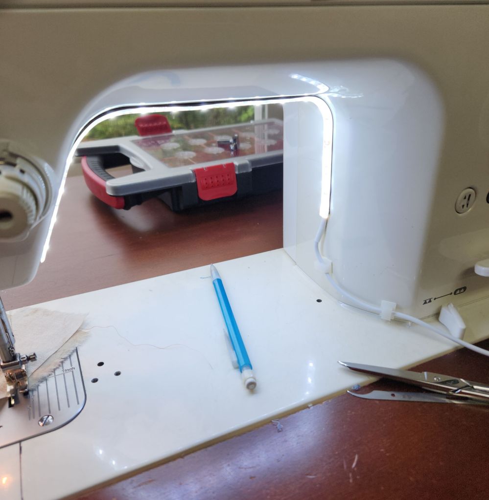When I got home I installed a new task light on my sewing machine. I bought this one and so far, I love it! My previous light was only illuminated the presser foot area. This one lights up everything!
