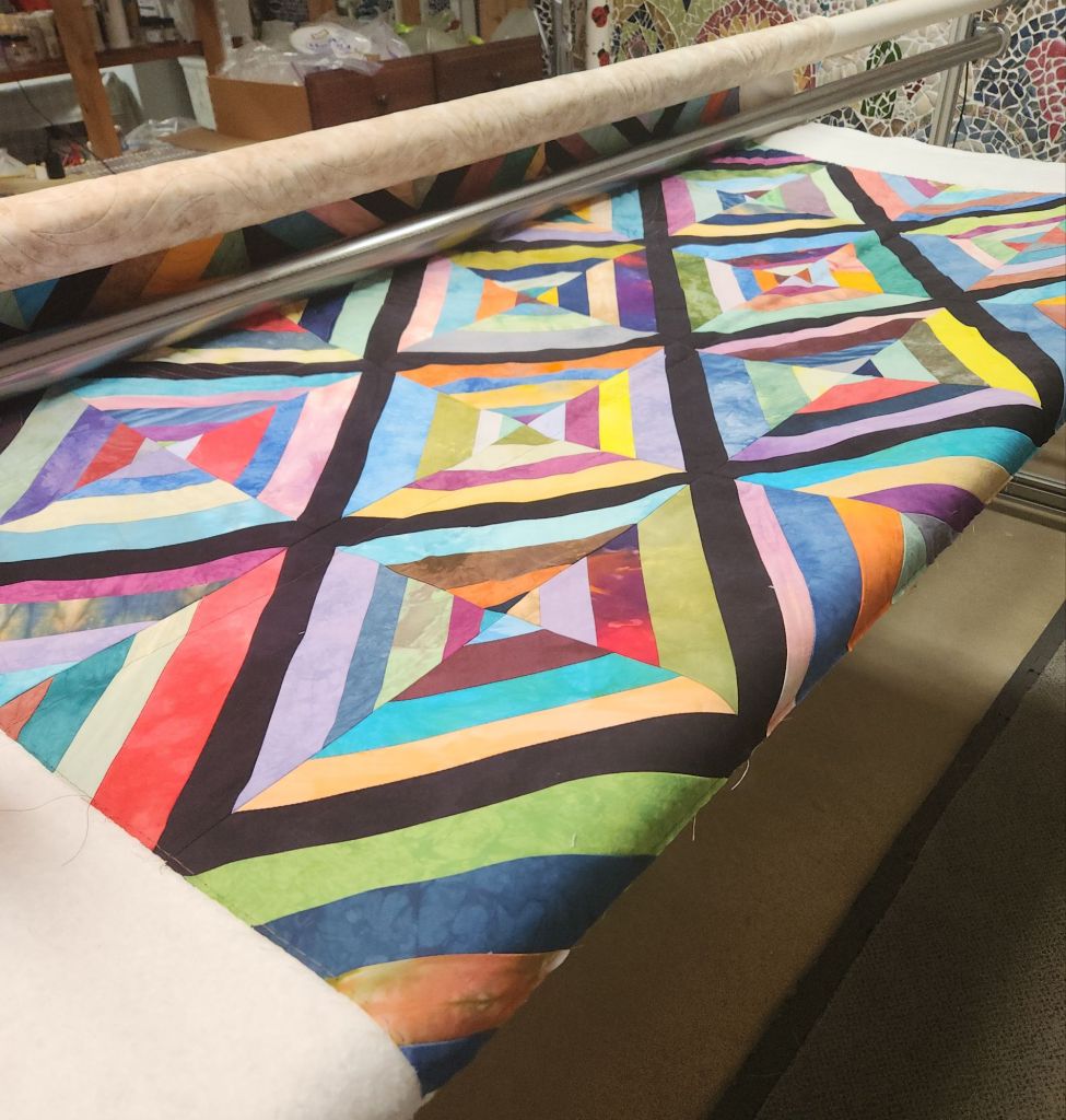 The weather here un Virginia was beautiful this weekend. I got to enjoy some of it Saturday while visiting friends and family. Before Mom and I left, I  got 2 more quilts loaded and quilted half of the first one. I used the same brand of thread as the one that misbehaved Friday. I also used the same needle and pantograph. I haven’t had 1 problem! The issue was definitely the thread. The bad thread will either be relegated to piecing or be trashed. I have two lifetimes worth of thread, so it doesn’t matter.