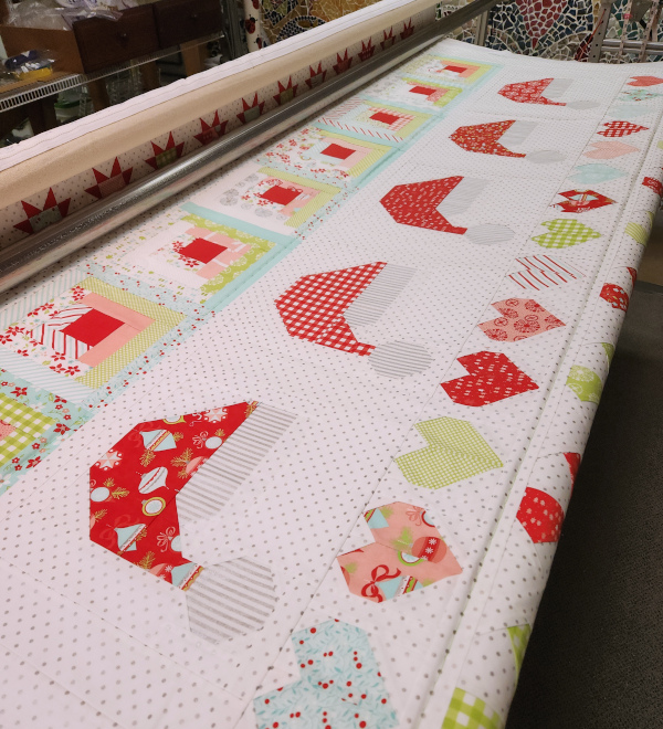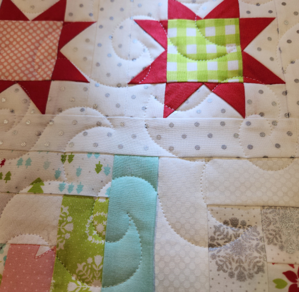 One project that I did start this weekend was quilting Kim’s Christmas quilt. I’m using the Happy Times pantograph. She just wants some light texture to keep the quilt soft and snuggly. I didn’t make a lot of progress this weekend but I’d like to finish it this week.