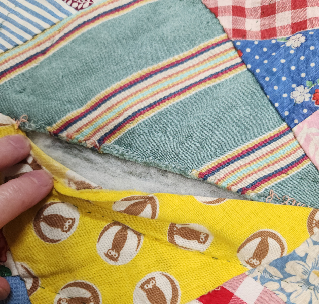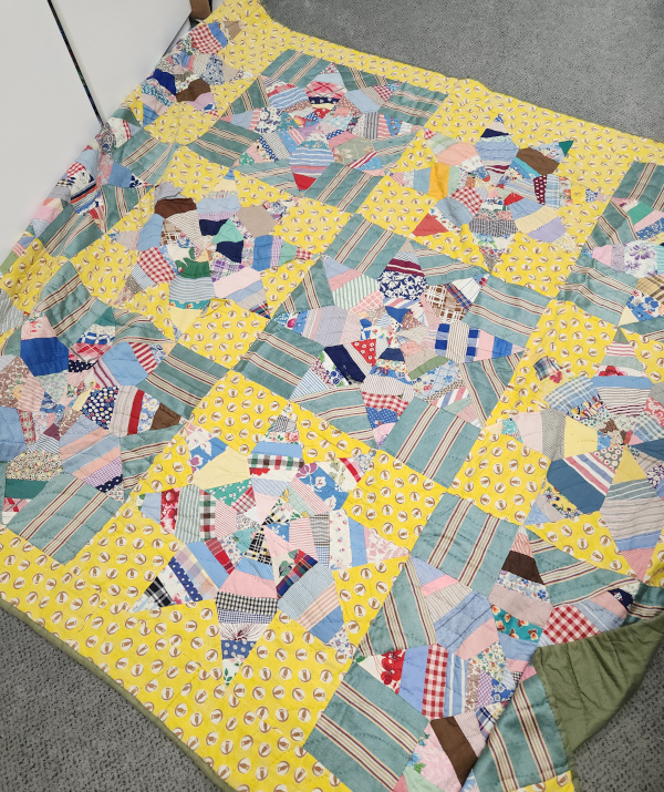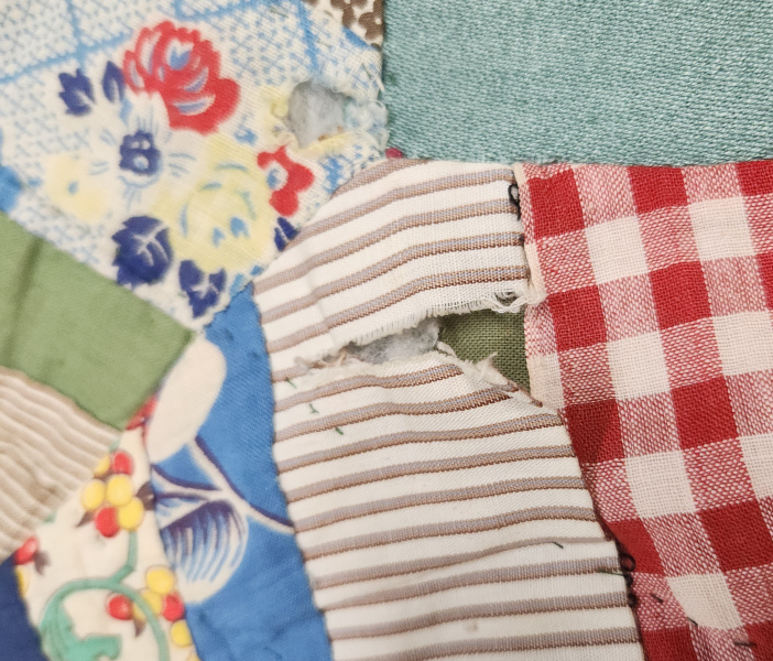 The second quilt was made by my Mom. She and I made sister quilts using these fabrics. This one is in pretty rough shape. There are a few holes and lots of worn areas. I’m not sure what I can do with this one.