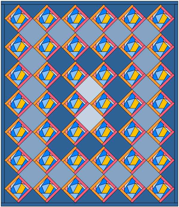 While watching football, I got out the laptop and EQ and worked up a couple of ideas for the Eclipse leftovers. I don’t think either of these is particularly creative but they will work and use up the fabric that I have leftover. The one on the left would finish to 52 x 61 and the one on the right would finish to 64 x 76. Do you have a preference?