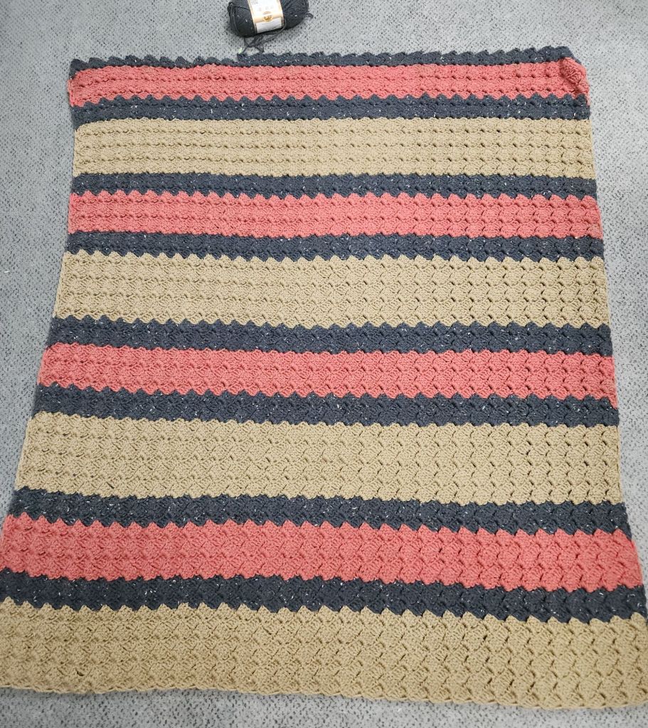 This will be a donation for a chemo or dialysis patient. It’s about 80% done. When finished, it will have 5 orange/gray sections.