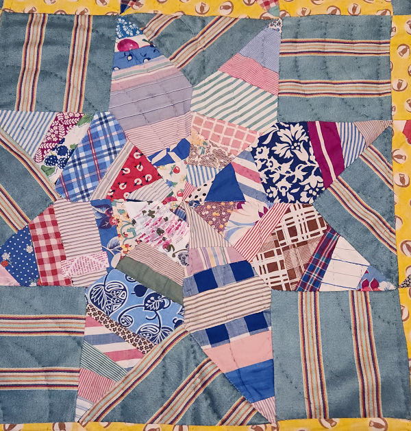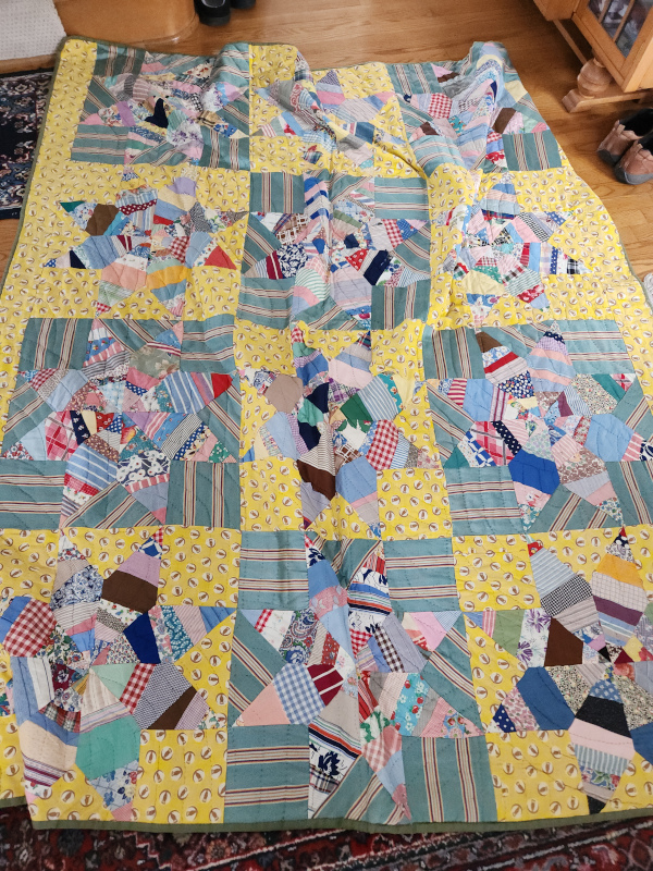 It turned out that 80% of the repairs were in these 2 blocks in the center of the quilt. The original patchwork is so haphazard that my new patches barely show up. I doubt if Matt will even notice. I know that what he loves best about this quilt is the yellow fabric and that’s all still intact.