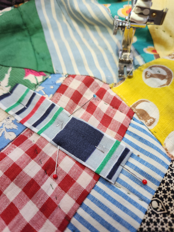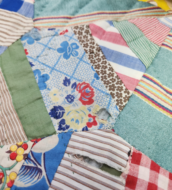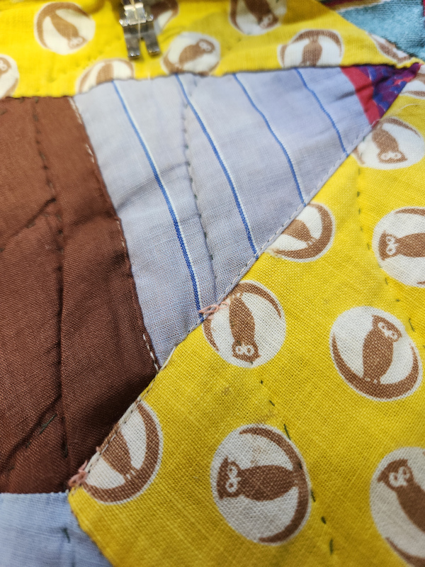 This was a very rudimentary repair. This quilt is not a heirloom. It’s the bed quilt that he uses all the time so my job was just to put it back together. Mostly I just needed to topstitch some seams closed but it also needed a few patches. I did use vintage feedsack fabrics to keep them the same age but these are the first machine stitches that this quilt has ever seen.