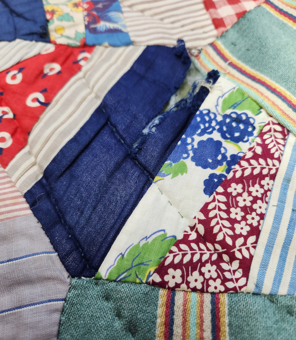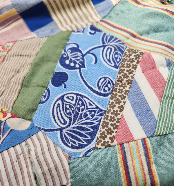 I had this one fabric that had shredded like old silk does. Fortunately, this is the only piece of this navy blue in the whole quilt. I just top-stitched a new fabric over it.
