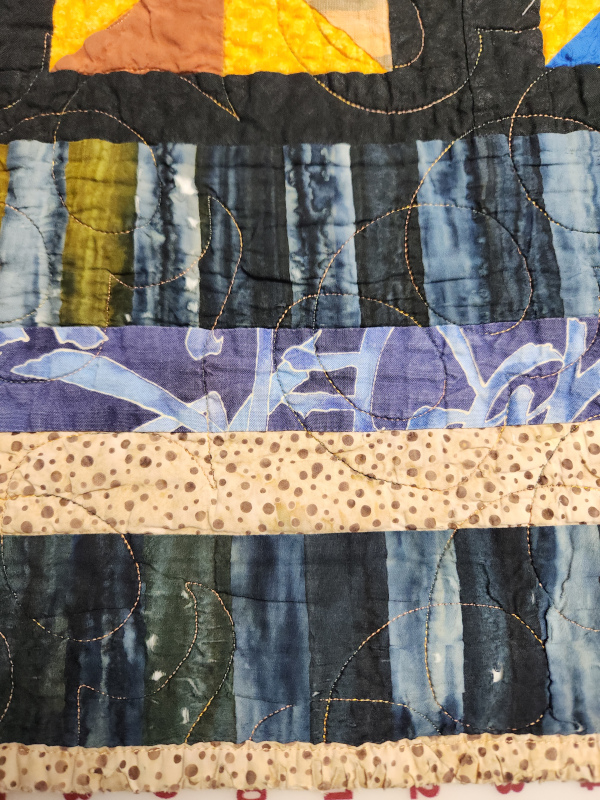 The star quilt took about 4 hours to do the repairs. The batik quilt only took about a hour and a half. The problems with this quilt were much more severe than the star quilt. The binding was a mess but the worst problem was this striped batik that was used in the border. I think the dye used had just eaten that fabric up and the entire border looked like this. I had already offered and given him a replacement full size quilt. I wasn’t willing to remove the binding, restitch and requilt the borders. But I was willing to cut it down to a smaller quilt that he could use on the sofa and he was amenable to that.
