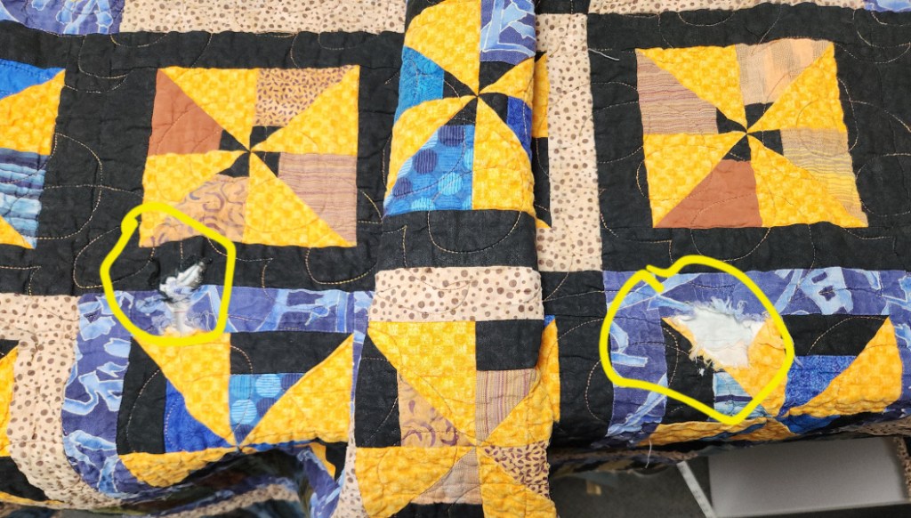 On top of the border and binding problems, it had 2 holes in the quilt and these holes went through all 3 layers. I’m guessing that one of his dogs might have caused this damage. Fortunately they were on the same row of blocks.