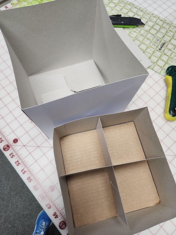 It turns out that the hard part was boxing them! I bought 8 x 8 x 8 boxes. I had to cut them down to 4.25″ tall and then used the cut off pieces to create the support grid on the inside. The boxes are flimsy so I also cut a piece of cardboard for the bottom.