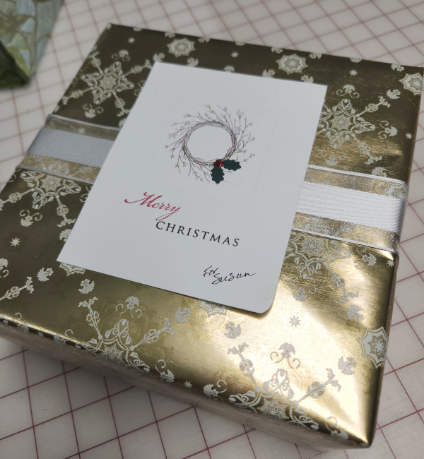 When I am traveling with gifts and need to stack them, I use old Christmas cards as my bow.