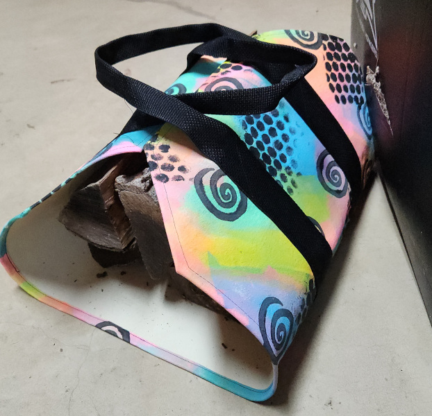 Lastly, after I hurt my back a second time hauling firewood, I made myself the fanciest log carrier ever and then made another for my friend. Hers is made from an old booth sign when I sold fabric at a quilt show. My carrier is holding up great so far.