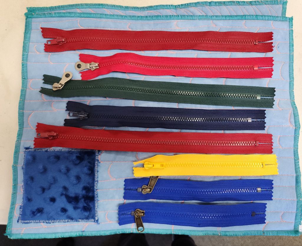 But before we left, I  had a few minutes of sewing time. I spotted a stack of quilted pieces to make fidget mats. I got out the serger and finished the edges and sewed on a soft patch for texture.  I was able to get far enough to pick zippers. I have 8 mats and 8 zippers. These can now wait until I have another sewing time void to fill.
