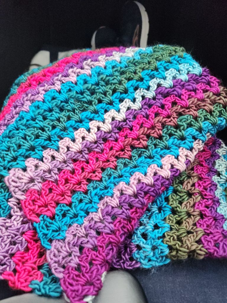 Back on the road, I decided to work on the scarf for the first day. I have 2 skeins of yarn and tried to calculate a width that would use all the yarn and give me a 60″ scarf. I started the day with 12.5 inches complete. I finished with 1 skeins finished and 30″ of scarf length! It looks like it’s going to finish 60″ long. A crochet “v” stitch is a perfect travel stitch.