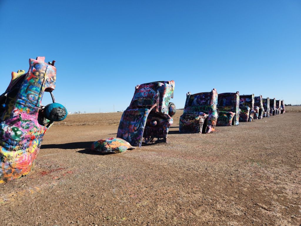 Oklahoma and Texas were very cold and windy but we did make a very quick stop to see Cadillac Ranch. It’s a fun, silly diversion from a long, boring drive.