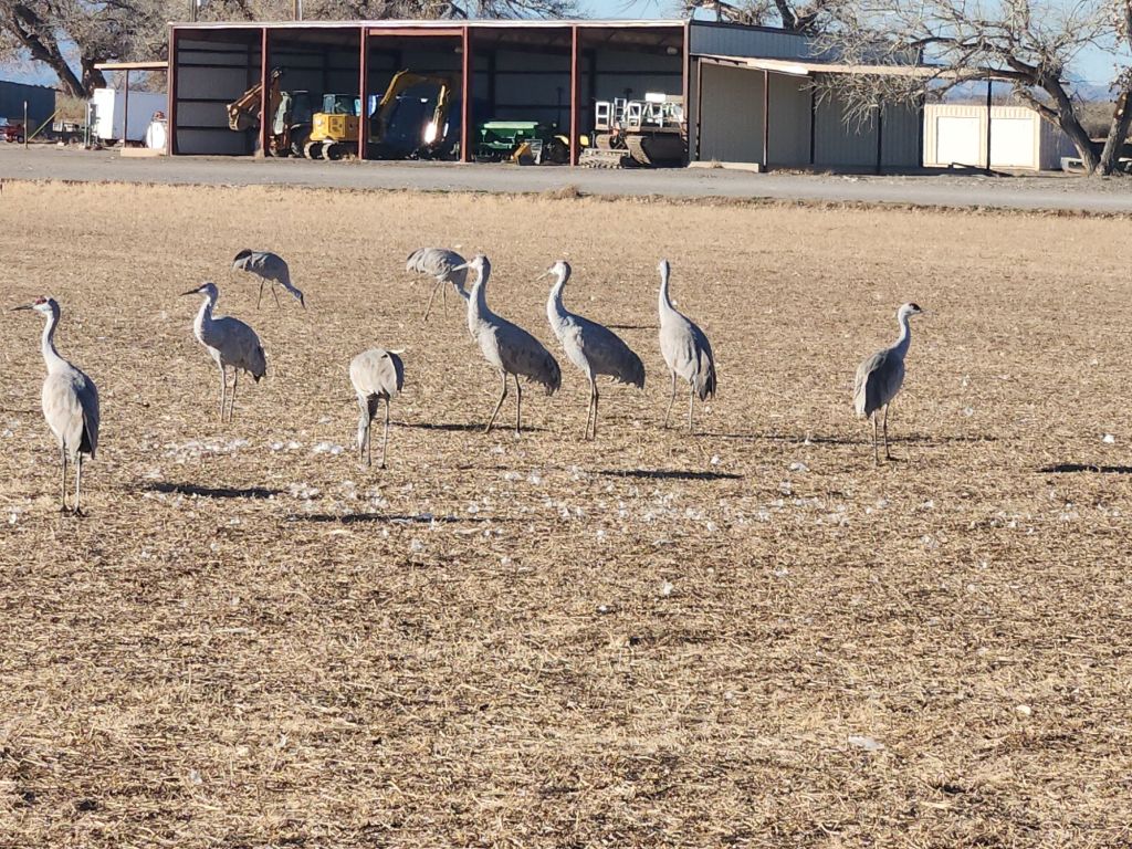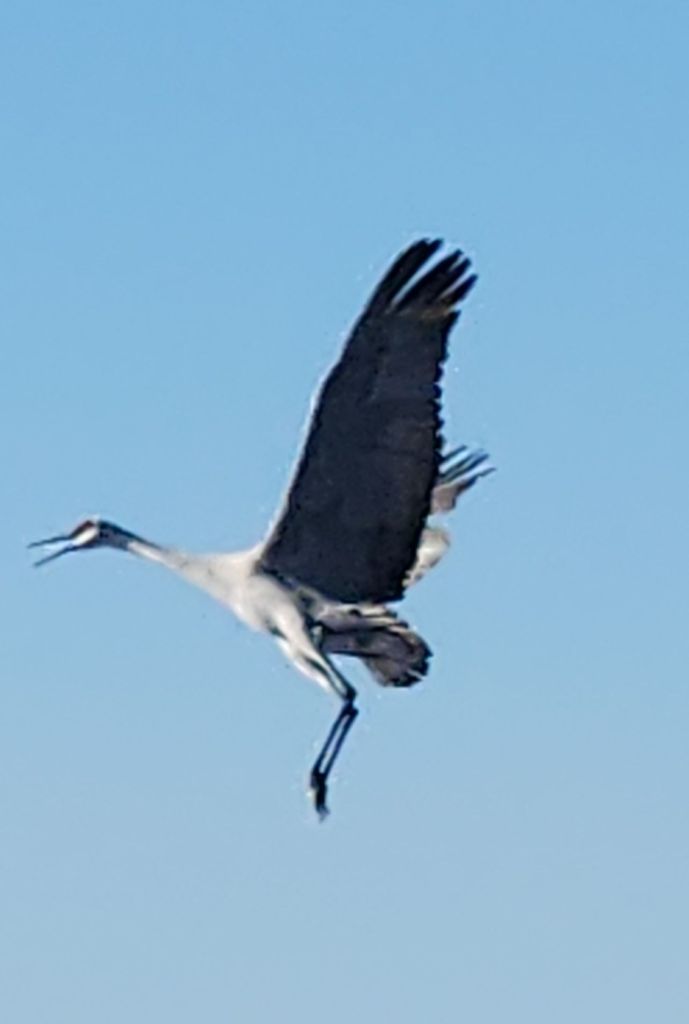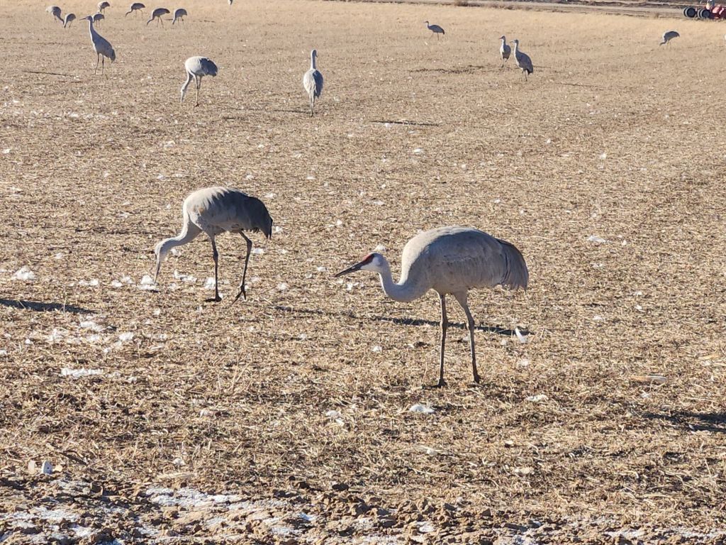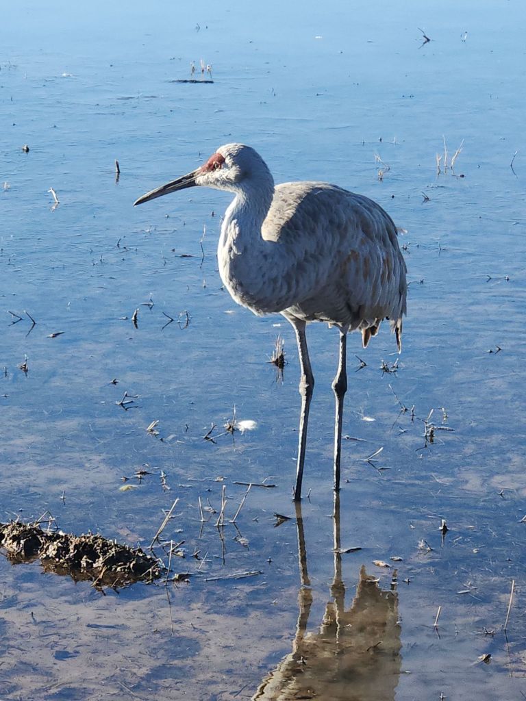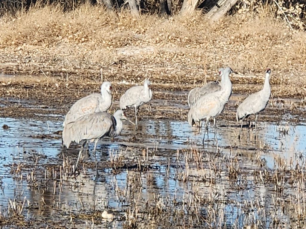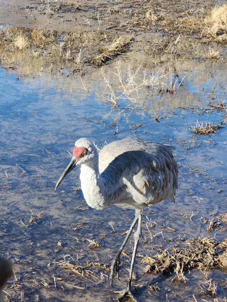 A friend recommended a stop at the Bernardo Wildlife Area, south of Albuquerque. It did not disappoint! We saw thousands of Sandhill cranes. There’s a 3 mile loop with several places to stop and watch. At one of them, one of the cranes walked right by us, stopping to turn and pose. They are very big birds and it was a treat to see them.
