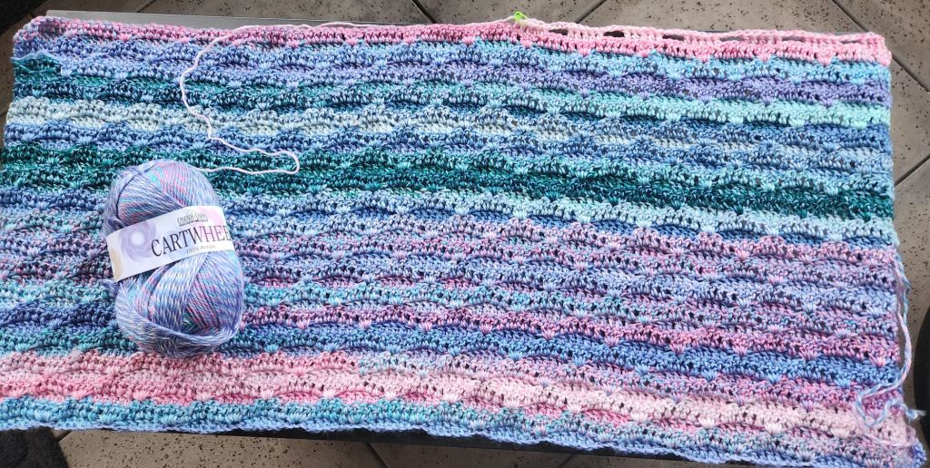 I haven’t done any sewing in a couple of days. I’ve been really focused on finishing a book that I was reading about Tombstone.  We’re planning to visit there soon. I have made a little progress on the big blanket.  This is made with two different colorways of the yarn. I didn’t have enough of either to make a whole blanket.  I’m alternating the colors and I  don’t think it will be a bad effect.