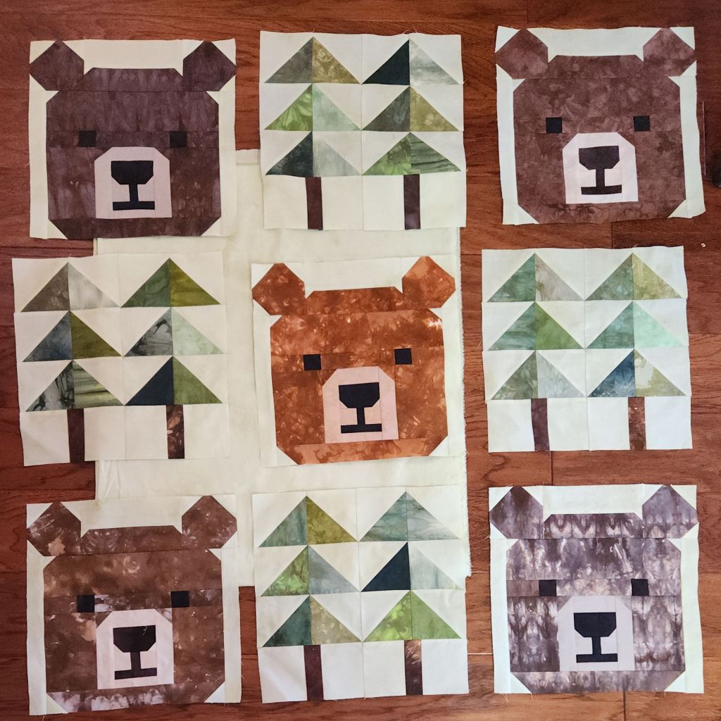 Here are a few bears and trees on the design floor to give you an idea for how they will look. We have sewing days coming up with my quilt club Wednesday and Thursday, I’ll use that time to get the top together.