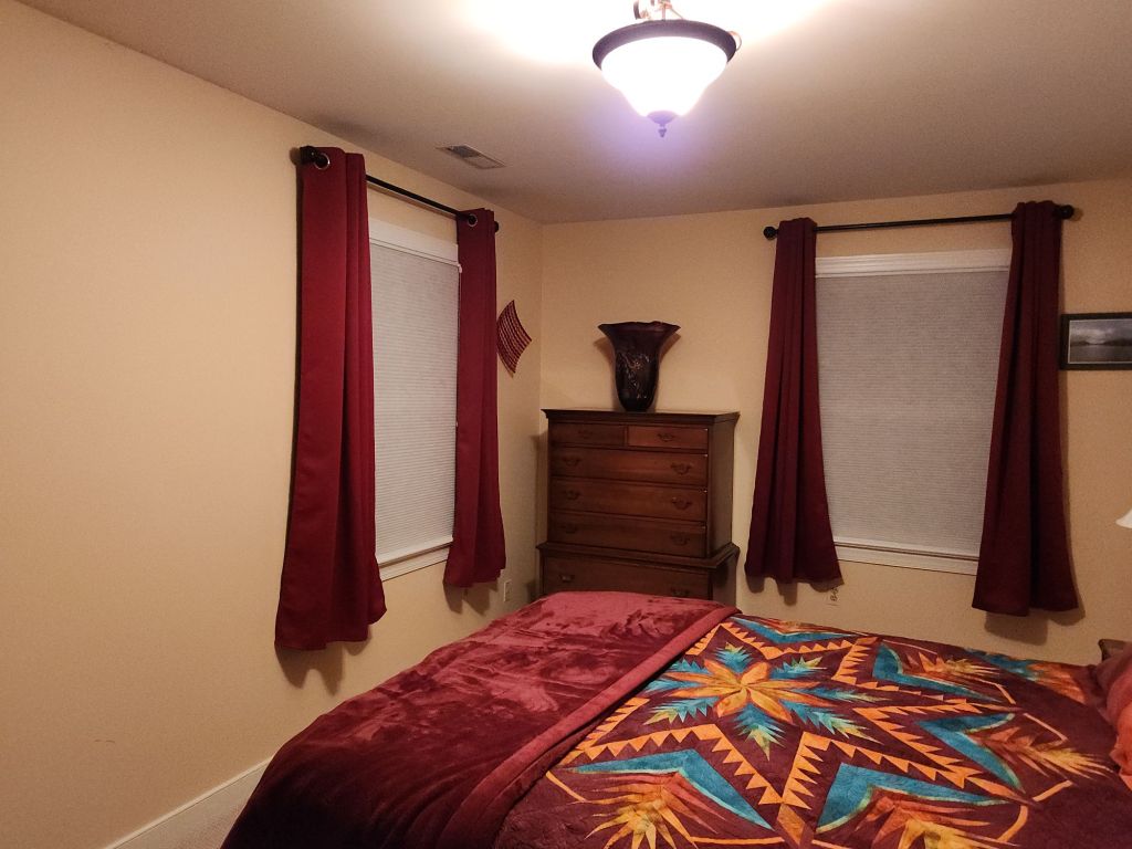 Chris and I also hung some curtains. We live on 10 acres but can see this neighbors house. I don’t really like window treatments. I think they just collect dust. But the neighbor recently added a security light and it’s super bright. I’ve only ever had shades on the guest bedroom windows and that’s not sufficient anymore. Now both rooms have blackout curtains. They are super cheap ones from Amazon. I suppose I could have made curtains but I honestly would rather do clothing repairs that sew home dec. I chose function over form. The last time Mom stayed with us I taped a black plastic bag to the window. This is an upgrade!