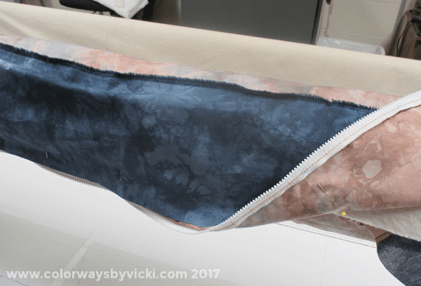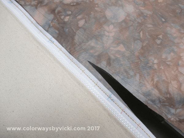 The first thing you need is more backing fabric. Cut a strip of fabric wider than that you need. I needed an extra 3″ but cut a new piece about 8″ to allow for seaming and pinning to the zippered leader.