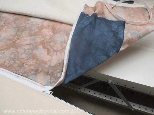 Now, using the channel locks, stitch all the way across the backing close to the zipper edge. You can see that I have about a 1″ seam allowance here. I want to get close to the edge but I don’t want to catch the zipper or be short on the extension fabric. That’s why I cut an extra wide extension.