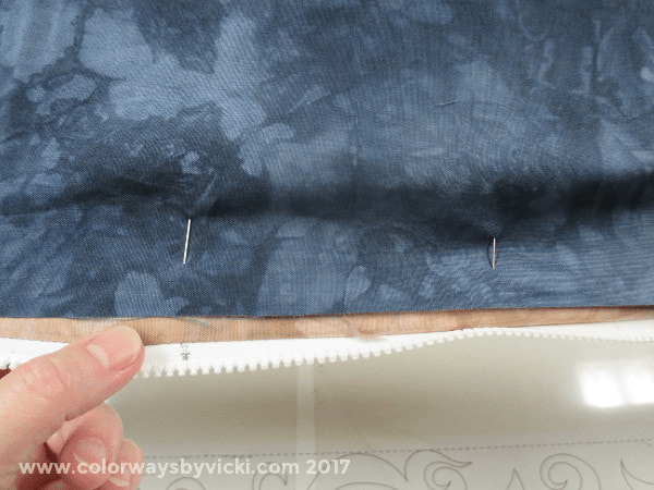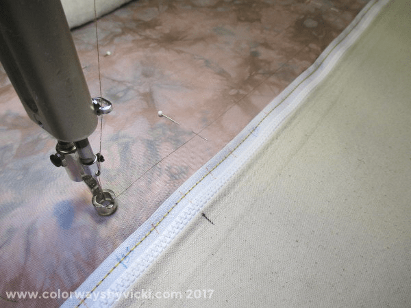 I”m aligning the edge of the extension about 1/4″ away from the edge of the zipper and you can see that I’m pinning from the wrong side of the backing because that’s the side that’s going to be facing up when it’s loaded. Pin the extension in place all across the width of the backing.