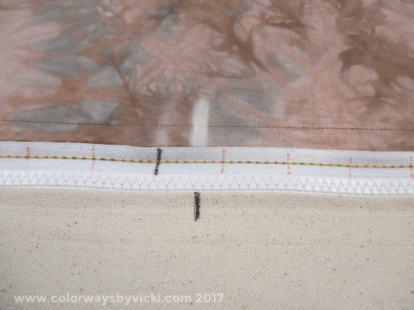 Use the center mark on the leader and mark a corresponding mark on the backing. This will help us to keep the backing straight when we re-pin it. (Ignore the center mark on the zipper. That zipper is about to go away.)