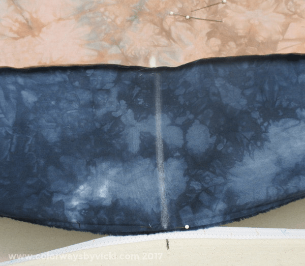 Here’s another view in case that last one isn’t perfectly clear. Pins are on the wrong side of the back. I also placed a few pins along the loose edge of the extension. That’s to keep the fabric from getting in the way while we seam it.