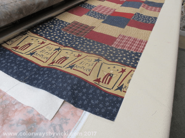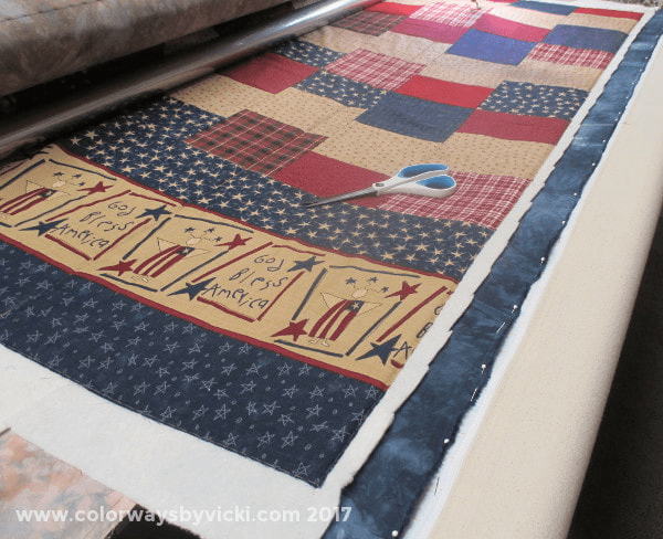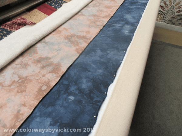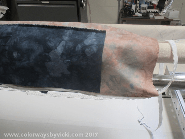 That wasn’t so bad, was it? It’s a lot better than taking the whole thing off the machine to sew the new piece on and then re-pinning and re-loading. Aside from cutting the fabric I never had to leave FloMo’s side.