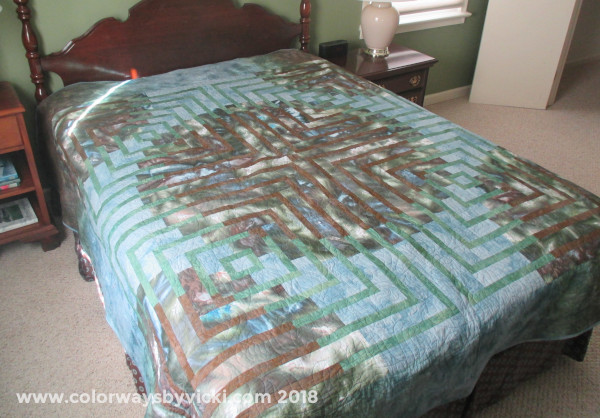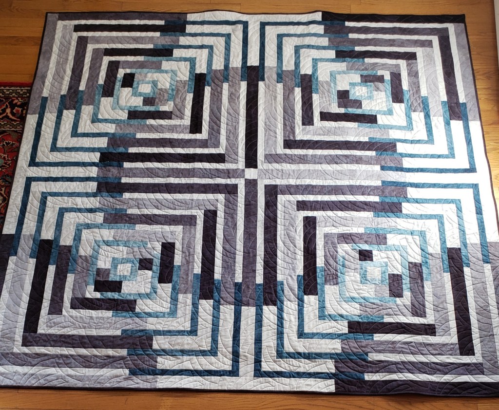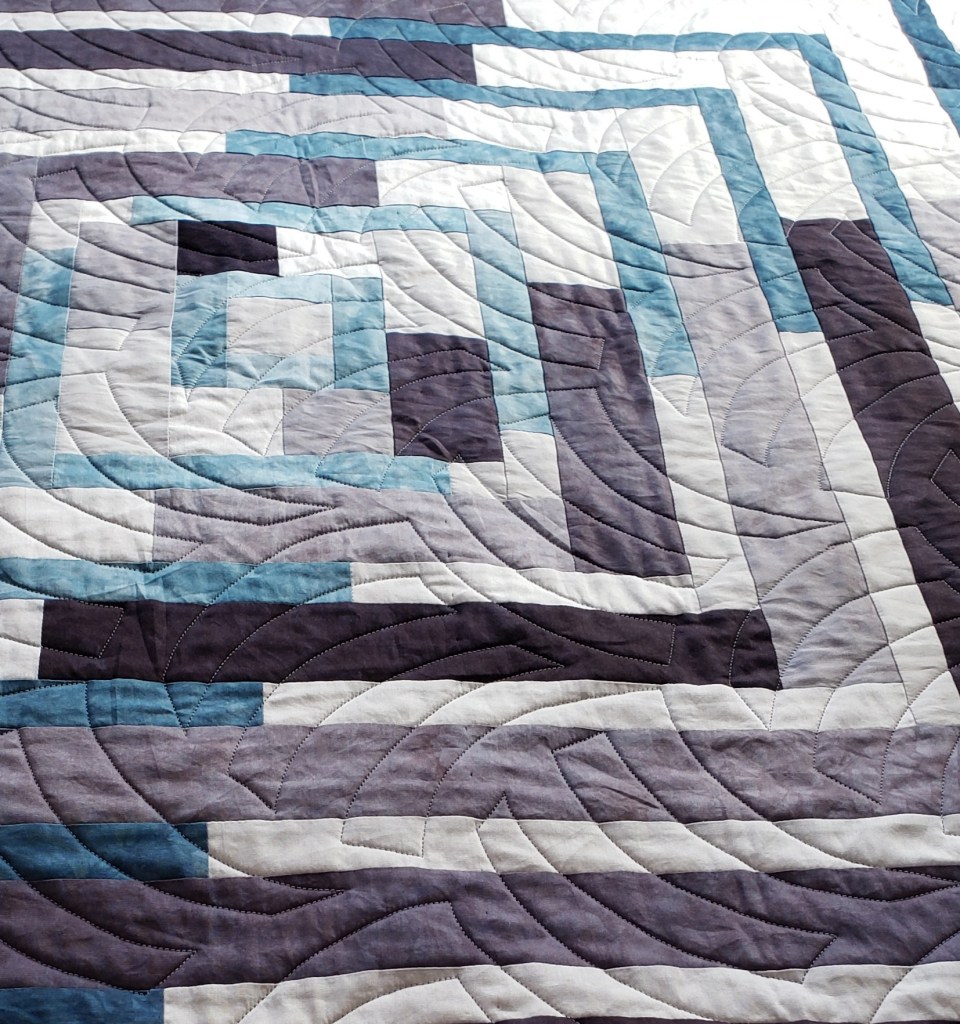 The second quilt was made for a wedding gift for the son (and wife) of friends. I did not know the bride but I studied their registry to get my color palette of grays with some blue. I dyed 8 steps of Black and 4 steps of Indra. I absolutely love how this one turned out.