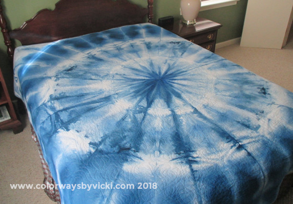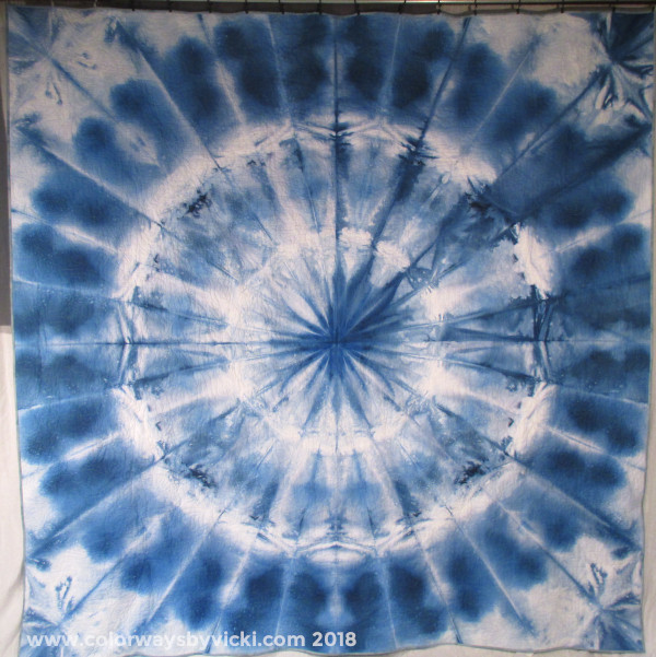 The back is an ice dyed mandala. I made this one a little different by putting the folded fabric in the bottom of the bin. It’s a very different, but still very cool, effect. As soon as I saw it come out of the dye bath I knew I wanted it for the back of this quilt.