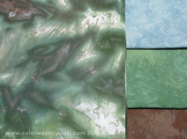 I had been wanting to make something with one of my Galaxy fabrics and this seemed like a perfect match. I picked the one at left because of the dark greens. I knew that this one would go well in the bedroom of our little guest house. I matched up green, brown and blue from the Galaxy fabric and dyed the coordinating fabrics and a gradient.